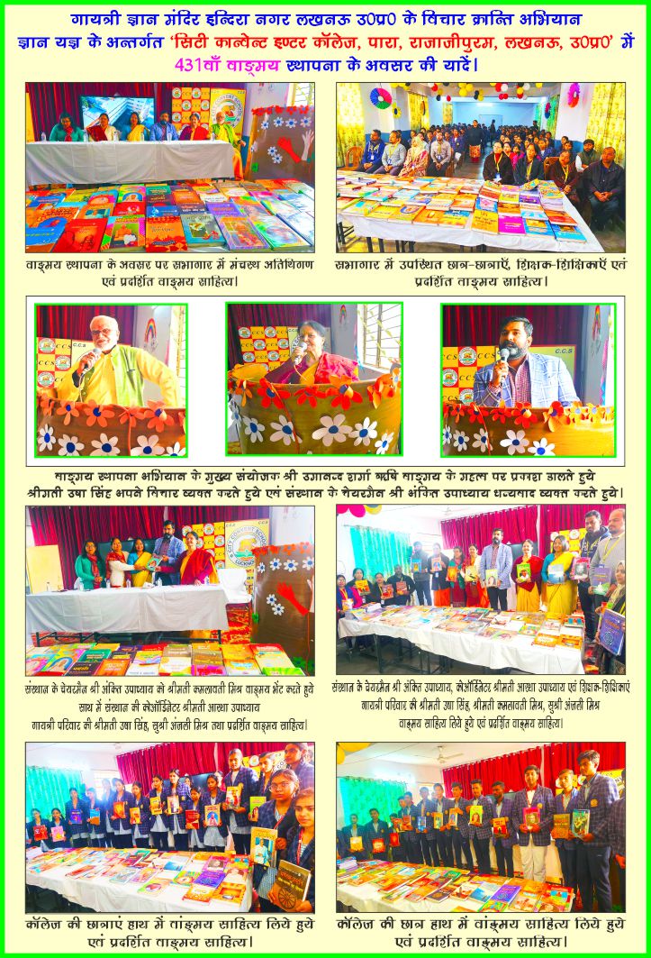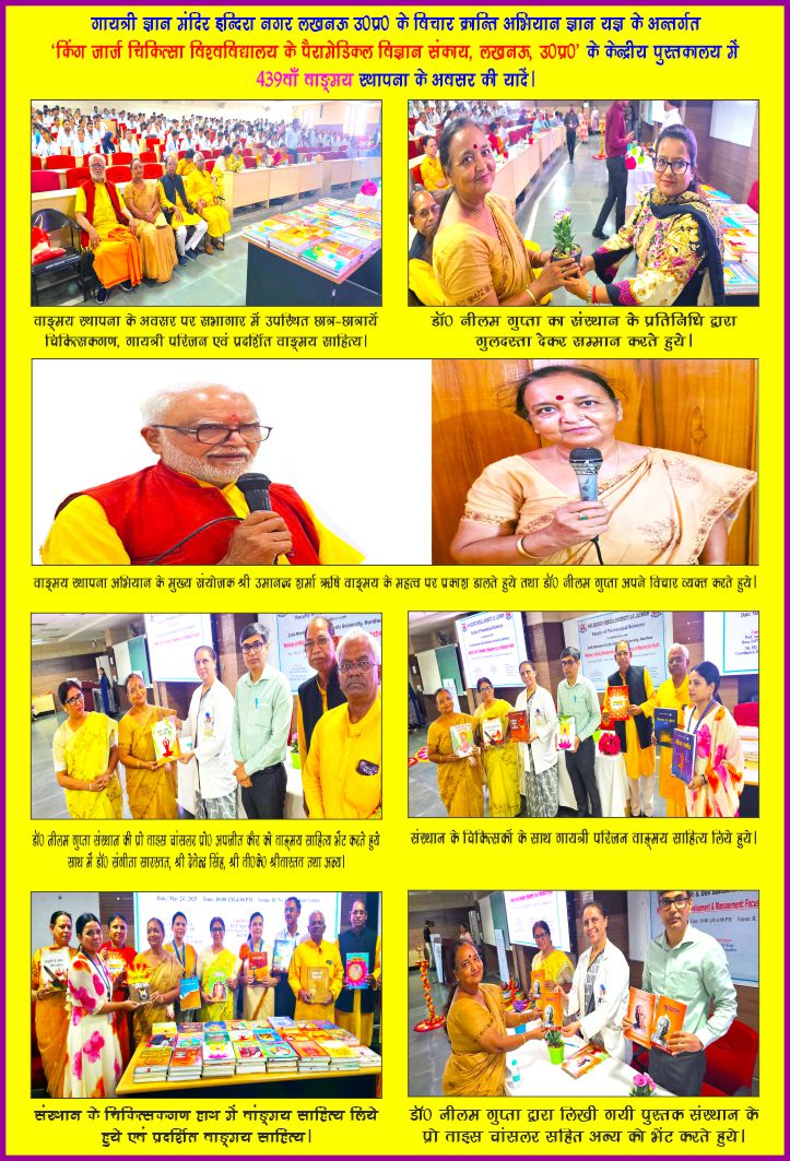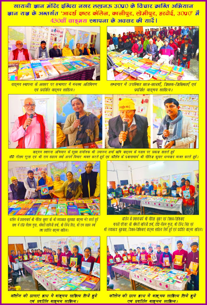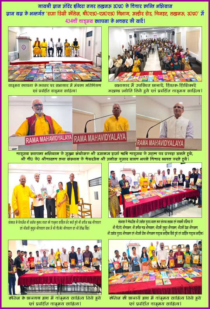 गायत्री ज्ञान मन्दिर, इंदिरा नगर, लखनऊ के विचार क्रान्ति अभियान ज्ञान यज्ञ के अन्तर्गत बलरामपुर गार्डेन लखनऊ में आयोजित राष्ट्रीय पुस्तक मेला (04 सितम्बर से 14 सितम्बर 2025 तक) में गायत्री परिवार के संस्थापक युगऋषि वेदमूर्ति तपोनिष्ठ पं० श्रीराम शर्मा आचार्य द्वारा रचित जीवन उपयोगी साहित्य मेले में प्रदर्शित किया गया। यह गायत्री ज्ञान मन्दिर, इंदिरा नगर, लखनऊ का 36वां पुस्तक मेला था।